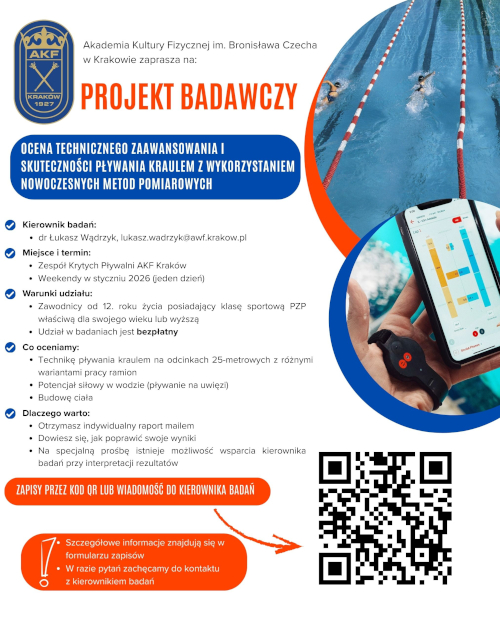 Badania Kadry Wojewódzkiej Młodzików Akademia Wychowania Fizycznego w Krakowie oraz Małopolski Okręgowy Związek Pływacki przeprowadzą badania z udziałem licencjonowanych zawodników klubów zrzeszonych w MOZP. Podstawowe informacje o badaniach: Temat badań: „Czynniki ...